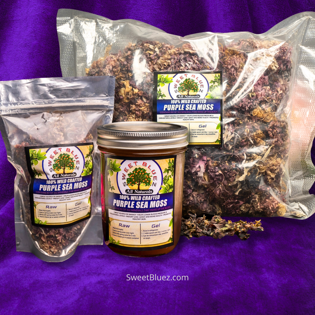 Sea MossSweet Bluez' wild crafted chondrus crispus sea moss is rich in minerals, omega 3 fatty acids, antioxidants & vitamins. A nutrient dense sea vegatable.