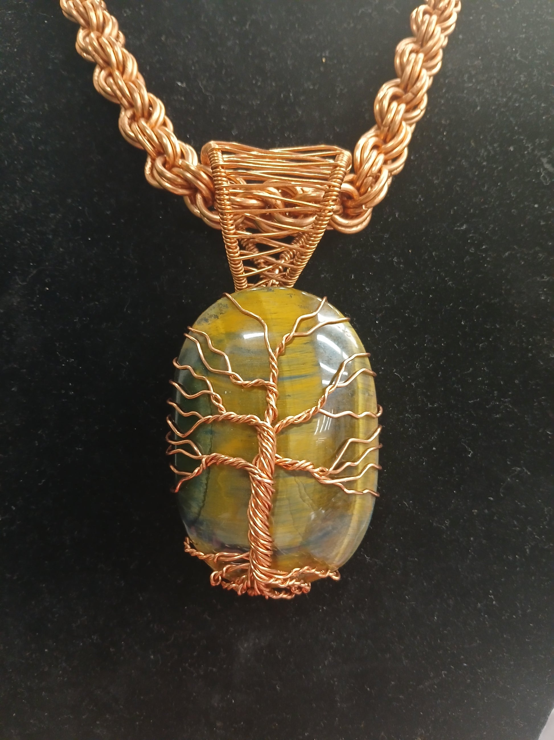Large 24-inch Handmade Copper link chain with Tigers Eye Copper wrapped Tree of Life pendant