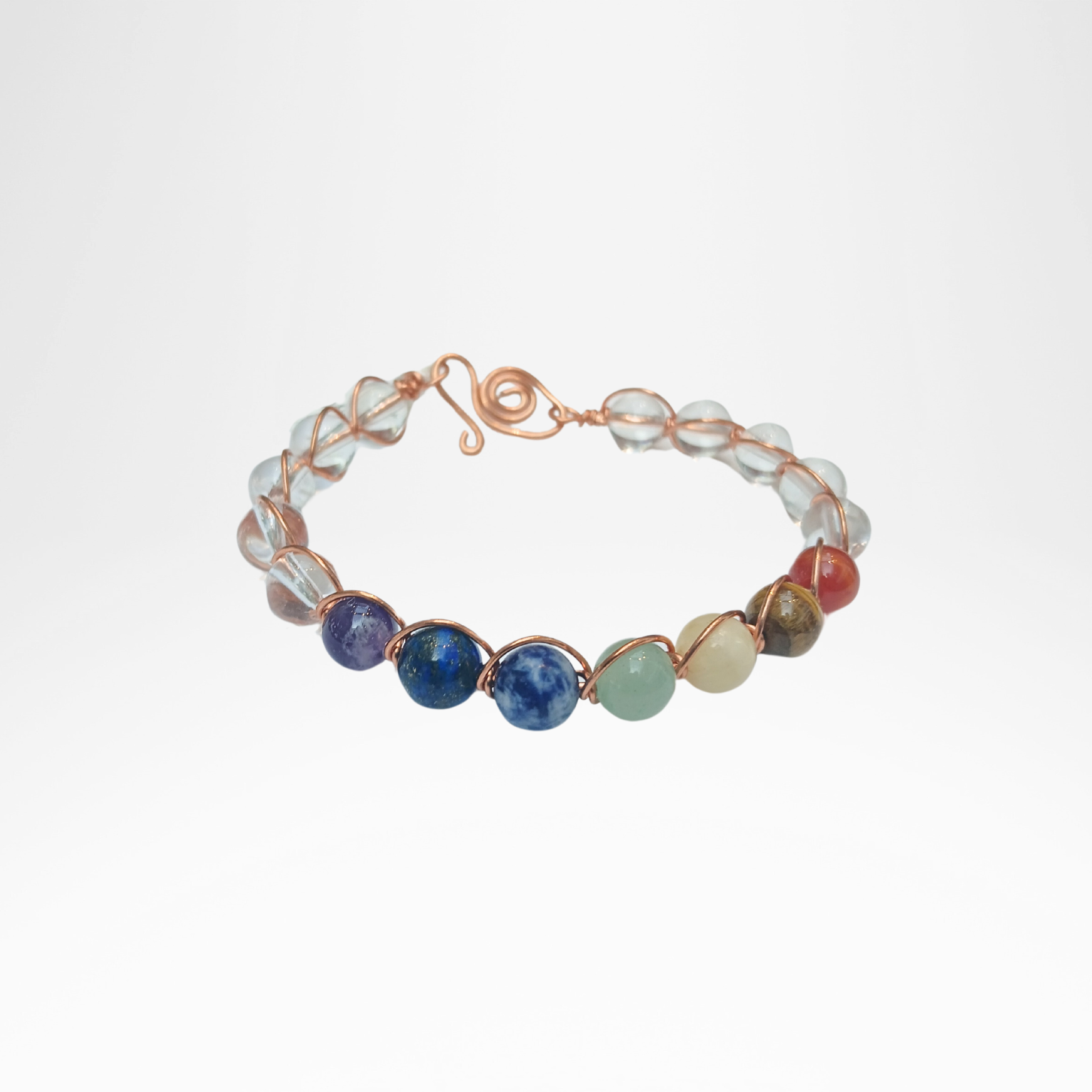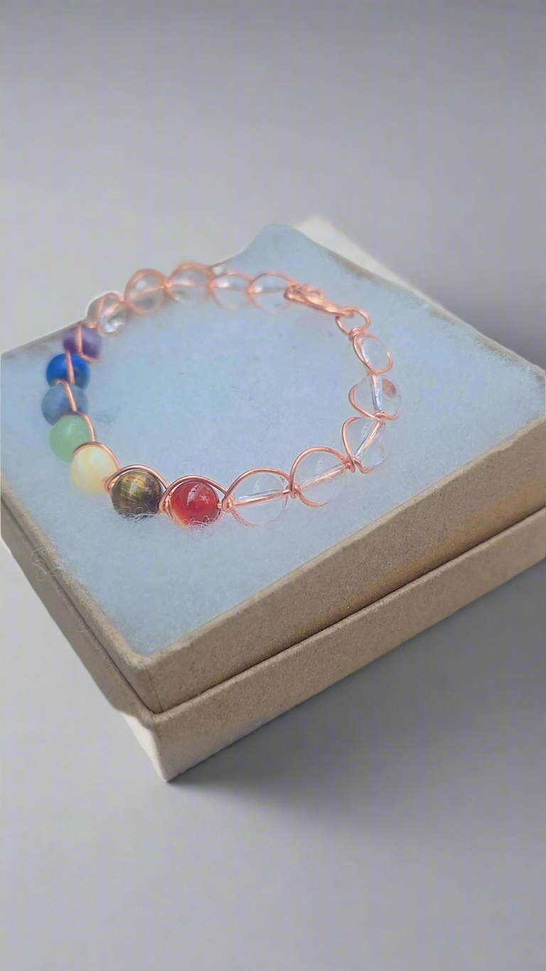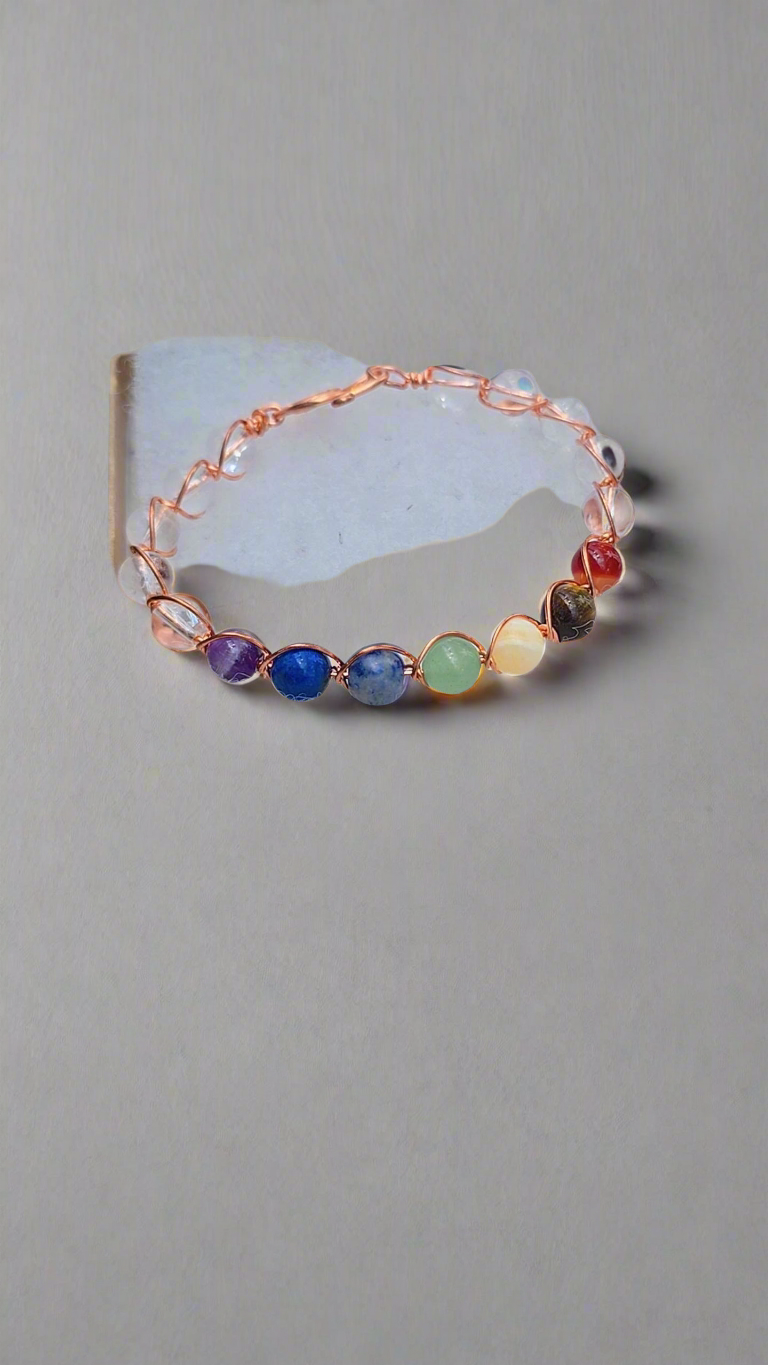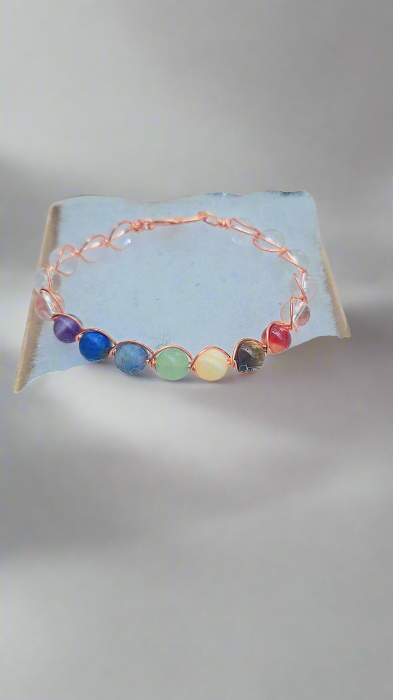 This is a 100% hand crafted copper wrapped "Chakra" bracelet. It consists of multiple crystals that corresponds to each chakra including clear quartz, Amethyst, lapis lazuli, green adventurine, yellow tigers eye..